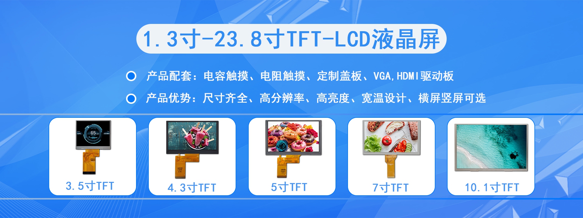 公司主營產(chǎn)品為0.96寸~27寸液晶屏及相關(guān)配套產(chǎn)品,主力尺寸為3.5”、4.3”、5”、7”、8”、9”、10.1”、11.6”、13.3”、15.6”。綜合月生產(chǎn)產(chǎn)量約500-800K。我們的產(chǎn)品超過60%為按客戶需求定制的產(chǎn)品,多年的行業(yè)經(jīng)驗(yàn)讓我們可以根據(jù)客戶的產(chǎn)品應(yīng)用提供建設(shè)性的定制建議。